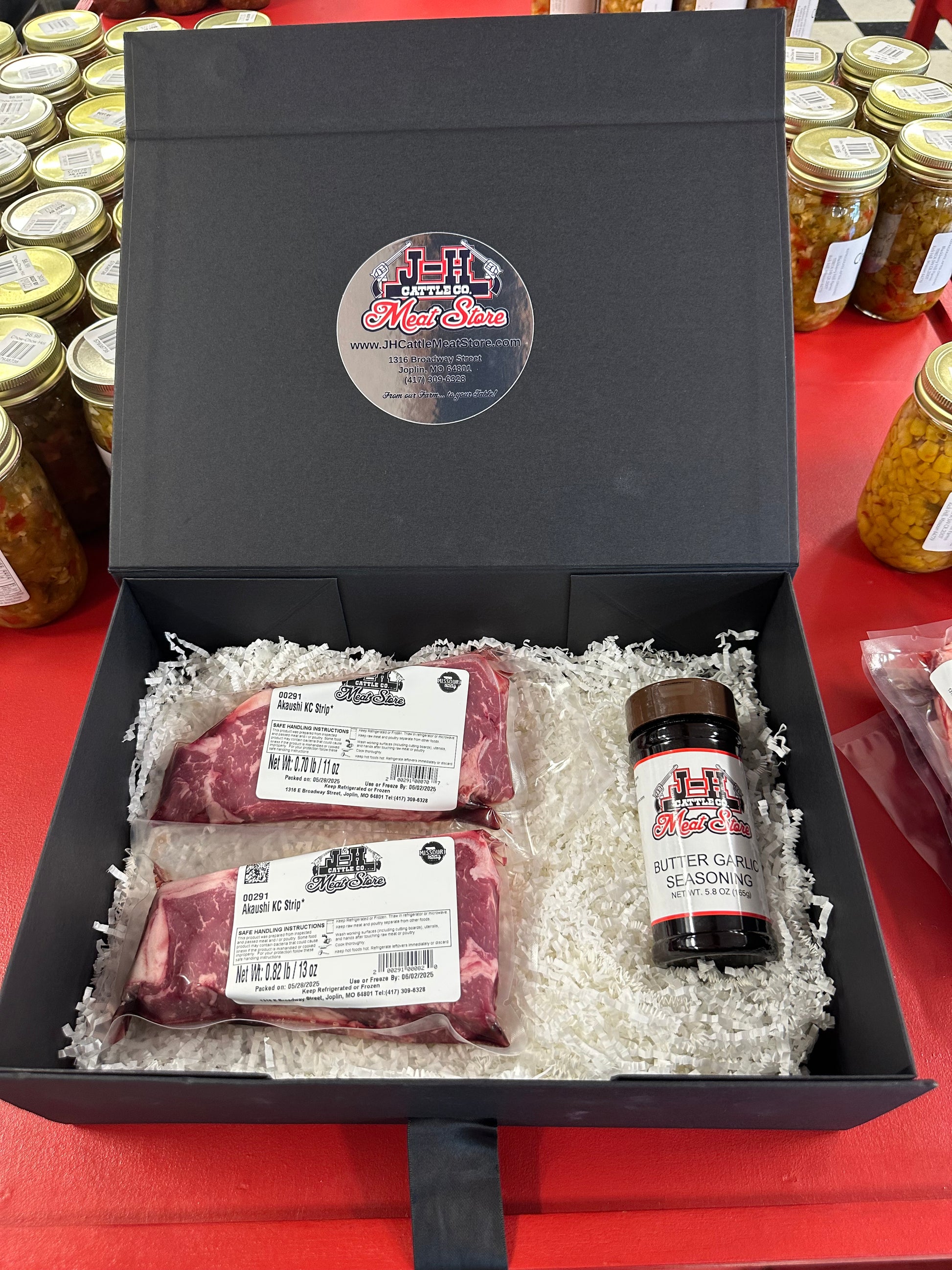 Two - approx. 10 oz. Akaushi KC Strip Steaks along with our favorite J-H Seasoning comes delicately packed in a custom gift box!