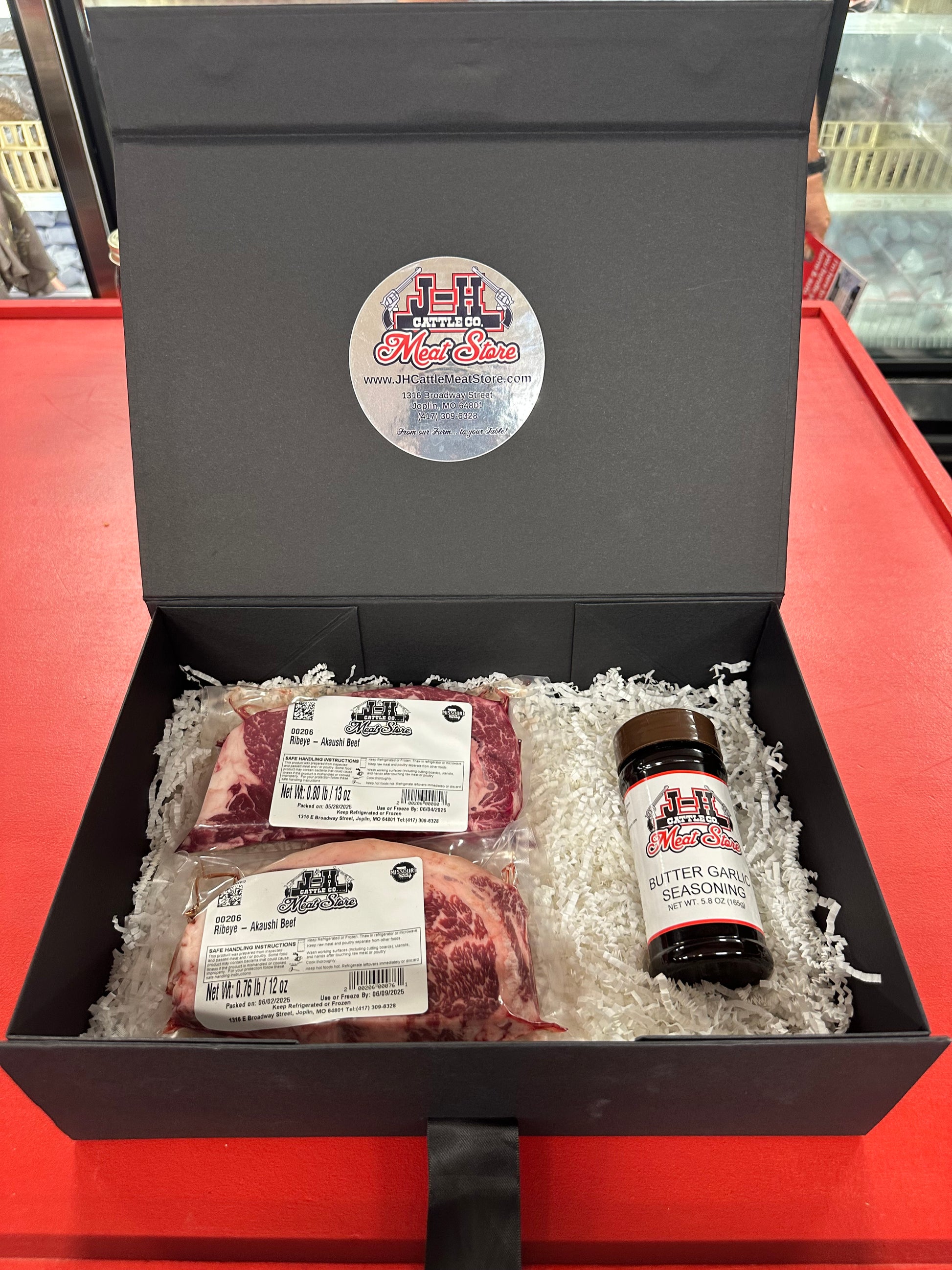 2 - approx. 12 oz. Akaushi Ribeye along with our favorite J-H Seasoning comes delicately packed in a custom gift box!